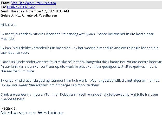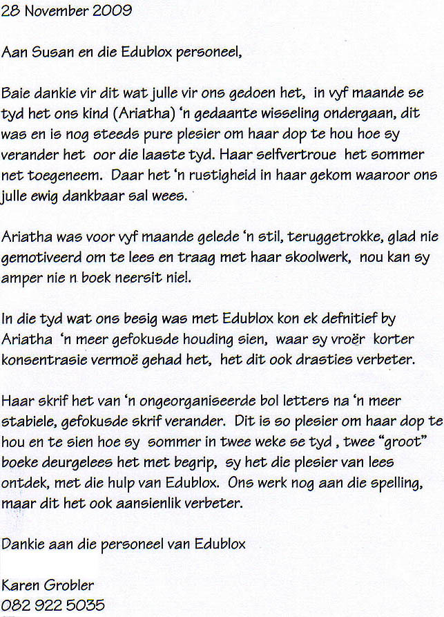 10 November 2010 Geagte Susan en Dames by Edublox RE: BAIE DANKIE VIR WONDERLIKE HULP Ons wil net vir die dames by Edublox baie dankie se vir al die hulp en bystand wat ons deur die jaar van julle ontvang het. Ons was baie bekommerd oor ons seun se ontwikkeling by die skool en die onderwysers het bly se dat hy nie gaan by bly nie. Hy het baie gesukkel om te lees en dit het al sy ander werk ook beïnvloed. Op sy laaste rapport aan die einde van sy Graad 2 jaar was sy lees maar `n twee en die res van sy punte het net so gelyk. Hy het toe in Januarie by Edublox begin met twee klasse `n week en het dit ongelooflik baie geniet, hy het uit gesien na elke Dinsdag en Donderdag middag se klasse. Na die eerste kwartaal kon ons al die verbetering op sy rapport begin sien. Aan die begin van die tweede kwartaal het Susan ook gesê sy kan die verbetering sien en dat hy baie vinnig vorder. Van die tweede kwartaal af het hy net een keer `n week Edublox toe gegaan. Sy derde kwartaal se rapport het gewys hoe goed dit met hom gaan. Sy punte is omtrent almal op na 4’s; hy kry nog `n 3 drie vir onvoorbereide lees maar dit het op `n 1 begin. Ons is baie dankbaar vir alles wat julle vir ons en Rijk gedoen het. Dit was ‘n wonderlike jaar en sy vordering het duidelik op elke rapport gewys. Baie dankie Deleen en Jaco van Tonder