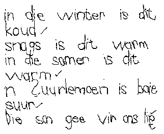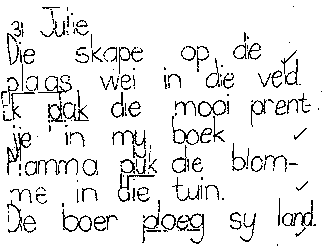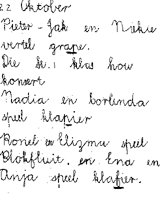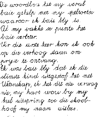 Mev L van Zyl: "Die resultaat was verstommend. Sy het geen probleme meer t.o.v. onderskeiding tussen links en regs nie en skryf ook nie meer agterstevoor nie. Haar konsentrasie het baie beslis verbeter. "Sy het tydens die prysuitdeling 'n sertifikaat vir verdienstelikheid in lees en skrif ontvang. Sy ontvang ook 'n boekprys vir Wiskunde, vir die beste punte behaal in Graad 1." Mev L van Zyl se oudste dogter het ook die program gevolg. Links is 'n voorbeeld uit haar Graad 3-skoolskrif, voordat sy met die program begin het. Regs is 'n voorbeeld uit haar Graad 4-skoolskrif, ongeveer 'n jaar nadat sy met die program besig was: