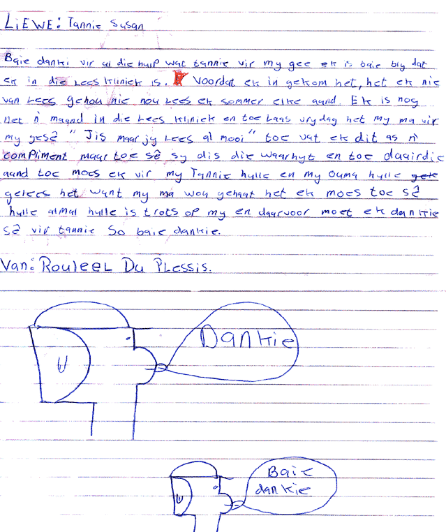 Lukas en Annemarie Kruger: "Dit is vir my voorwaar ‘n voorreg om hierdie skrywe aan u te rig en u te bedank vir dit wat die Leeskliniek vir Janine beteken. Ons kon werklik al vanaf die eerste week ‘n verbetering in haar leesvaardighede bespeur. Sy het die leeswerk wat hulle by die skool gekry het ook met meer selfvertroue begin aanpak en lees. "Haar algemene selfvertroue het skielik begin verbeter sedert sy by die Leeskliniek begin het. Haar taalvaardighede verbeter ook en daar is ‘n merkbare verbetering in haar kommunikasie. Ek moet erken dat dit party dae moeilik gaan om aan die gang te kom met die oefeninge, maar die beloning is beslis daar om die vordering te sien. "In die verlede het dit telkens gebeur dat Janine laat blyk het dat sy glad nie van lees hou nie. Dit het skielik verander en sy lees deesdae ook vir haar maatjies voor as hulle kom kuier. Waar daar ook in die verlede vir ure gesukkel is met haar leesles van die skool, bemeester sy dit deesdae binne twee tot drie keer wat sy 'n les deurlees. "Ek kan dus net sê dat ons slegs positiewe veranderings bespeur by Janine sedert sy begin het by die Leeskliniek en ons kan dit ten sterkste aanbeveel vir enige ouer om sy/haar kind daarheen te neem." 'n Briefie van Rouleen, een maand nadat sy by Edublox aangesluit het:
