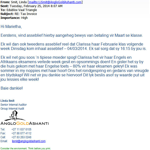 From: rikav@mcmotor.co.za Goeie more Mareli Ek wil jou maar net so stukkie terugvoer gee aangaande Nicole (Gr 8). Sy is nou van verlede kwartaal af by julle (van ons haar rapport gekry het) – sy het op daardie rapport 4 vakke gedruip. Sy het pas haar nuwe rapport gekry: sy is al haar vakke deur en haar gemiddeld het met ±5% gestyg! Baie dankie vir julle hulp. Vriendelike groete