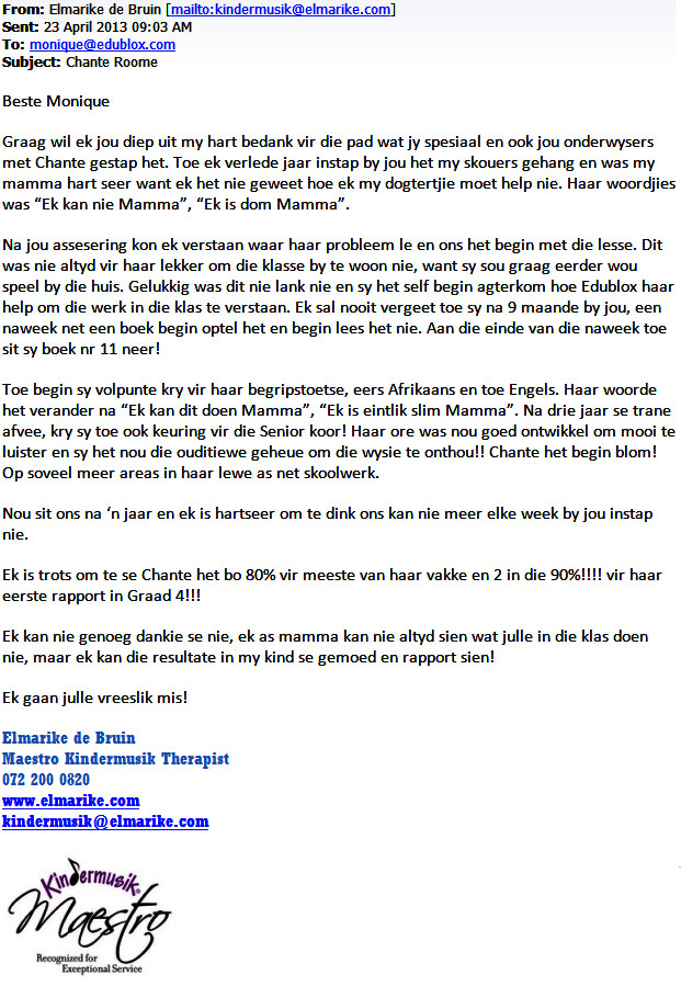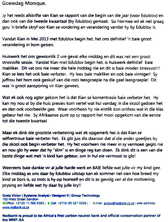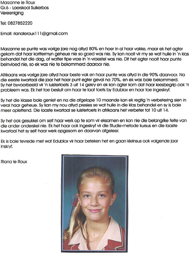 Geagte EDUBLOX Graag wil ek net Edublox prys vir die goeie werk wat julle doen. Ons dogtertjie Stephane was 8 jaar oud en in graad 2 toe ons agtergekom het sy het ‘n leesprobleem. Sy kon nie vlot lees nie, en het amper al die woordjies hardop uitgespel, letter vir letter. Ons het dadelik vir Lizani by Edublox gaan sien om vas te stel wat is die graad van Stephane se agterstand. Na die assessering was dit duidelik gewees dat Stephane intensiewe aandag nodig het om die agterstand in te haal. Ons het dat Stephane die intensiewe kursus bywoon. Vandaar af woon sy elke week die Edublox klasse by. Ons is Edublox ewig dankbaar, daar is ‘n groot verbetering in Stephane se leesvaardighede asook haar geheue het verskerp. Ons kan die program aan enige iemand aanbeveel. Baie sterkte met al julle toekomstige diens. Groete