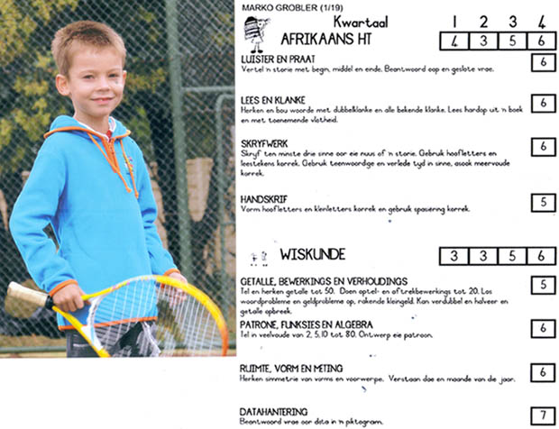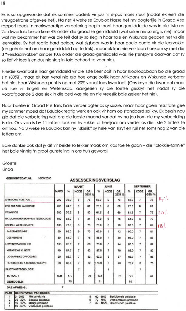 Mev Taute van Polokwane: “Afrikaans, Engels en Wiskunde punte het van die eerste na die vierde kwartaal verbeter van 47 tot 60, 46 tot 52 en 47 tot 74. Ook LWO het verbeter van 48 tot 71. Sy selfvertroue in die algemeen het verbeter en hy is nou ook trots om sy punte te vertel.” ![]()
