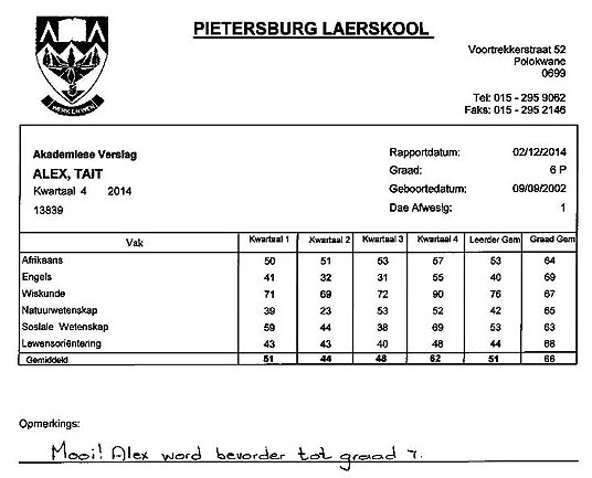ALEX TAIT Alex het baie sleg gedoen met sy skoolwerk, hy kon nie lees nie en as gevolg daarvan kon hy nie sy toetse of sy huiswerk lees nie, en sodoende dit ook nie antwoord nie. Nadat die departementshoof my ingeroep het, het ek besluit om hom by Edublox in te skryf. Alex het in September 2014 by Edublox begin en drie klasse per week bygewoon. Hy het vanaf die eerste dag by Edublox dit baie geniet en kon nie wag om terug te gaan elke keer nie. Ek het dadelik 'n verandering agtergekom in die sin van dat hy self sy vrae en opdragte lees in plaas daarvan om my te kom vra om vir hom die vraag te lees. Sy punte was in die derde kwartaal 48% en het opgegaan tot 62% in die laaste kwartaal van die jaar. Sy handskrif het effens verbeter maar daar is nog baie werk daaraan. Janine Tate Alex se gemiddeld het verbeter van 48% in die derde kwartaal tot 62% in die vierde kwartaal: ![]()
