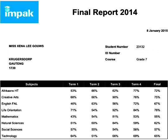 From: Claassen & Claassen Training [mailto:cctraining2@webmail.co.za] Hi, Ek wil net BAIE dankie sê vir die program wat julle het om ons kinders te help, ek is regtig so dankbaar. Matthew se gemiddeld het die kwartaal met 9% verbeter en ons is so bly en trots op hom en ek weet julle program is deel van sy verbetering. BAIE baie dankie!!! Groete Sonja Coston Opvolg, Oktober 2014: Nadat Matthew se gemiddeld van die eerste kwartaal tot die tweede kwartaal met 9% verbeter het, het dit met nog 4% gestyg. Sy gemiddeld aan die einde van die derde kwartaal was 63%: ![]()