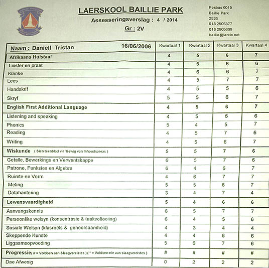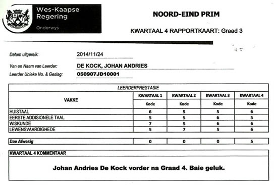 Chantalle de Kock: “Dis ‘n jaar later en nie net het Deon se selfvertroue met rasse skrede verbeter nie, hy is ook besig om sy ‘bonus’ te verdien. Dit was wonderlik om Donderdag sy rapport te kry en die resultate van sy ywer te geniet. Sy algehele gemiddeld het van ‘n lae 60% na 72% gestyg. Die beste verbetering was in sy tale met 77% vir Afrikaans en 79% vir Engels!” Lees verder...