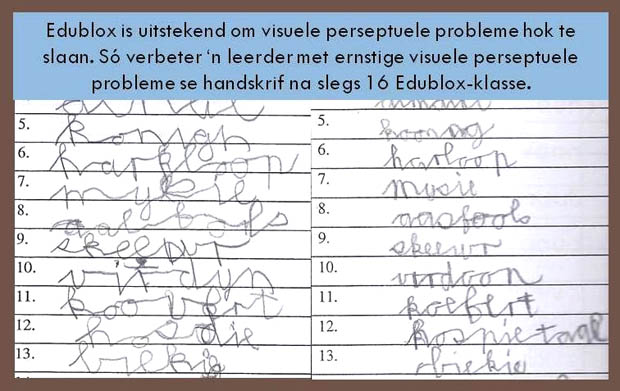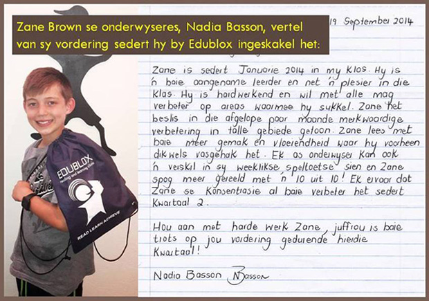 Wilna Taljaardt: “Aanvanklike Edublox assessering op 21 Februarie 2014 het die jufrou se bevindinge bevestig. Ons is tans so 50% deur die aanbevole ure en daar is merkwaardige verbetering aan sy skoolwerk. Sy konsentrasie is baie beter en sy selfvertroue het beslis 'n hupstoot gekry. Guillaumé lees buite skool boeke op sy eie, sonder aanmoediging. Voorheen was hy te bang om te lees, en hy kon ook nie vir jou die storie terugvertel nie.” Lees verder...